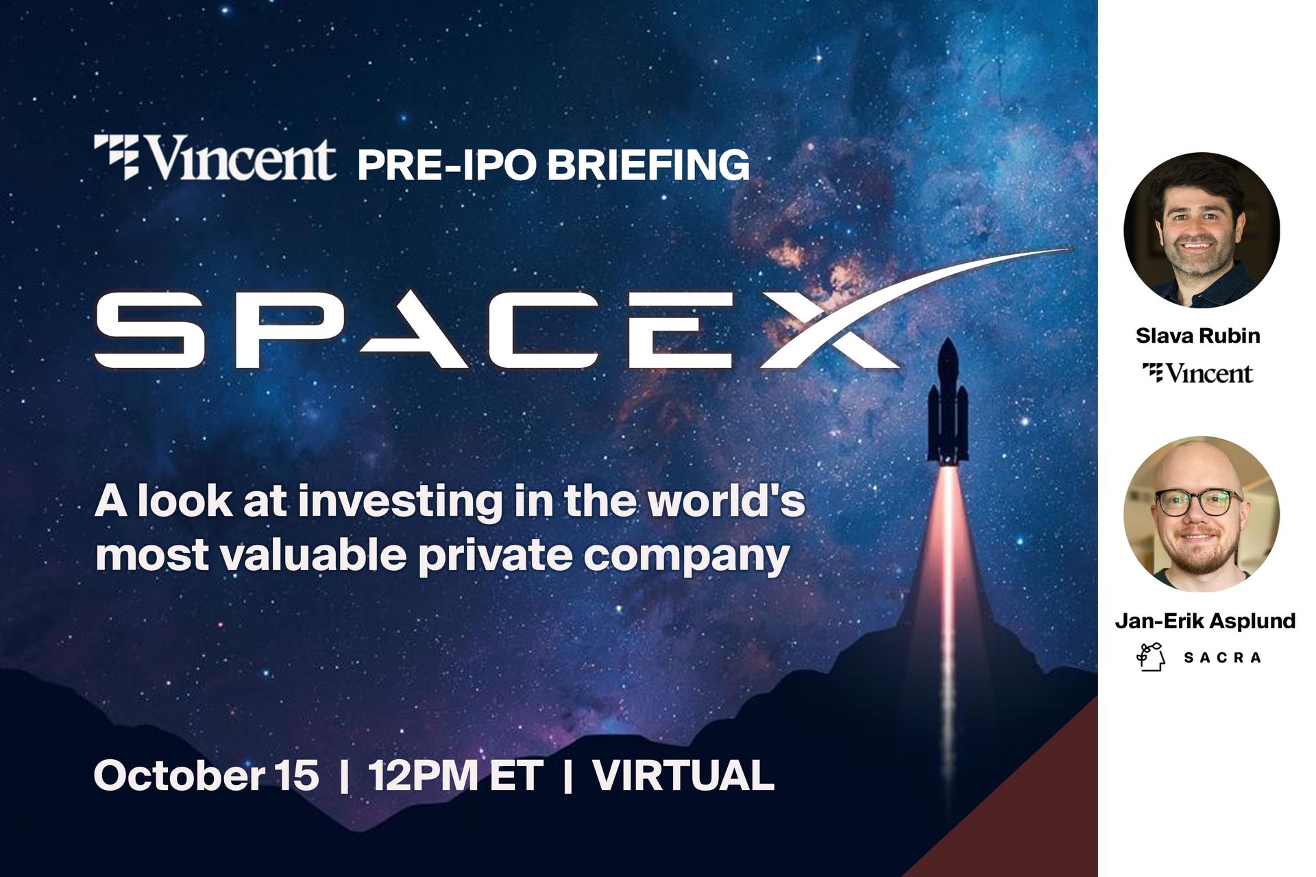 Vincent co-founder Slava Rubin and Sacra co-founder Jan-Erik Asplund will explore the business of SpaceX, the world’s (2nd) largest private company. They’ll talk about the company’s growth, what risks to consider, and how to contextualize valuations in today’s market environment.